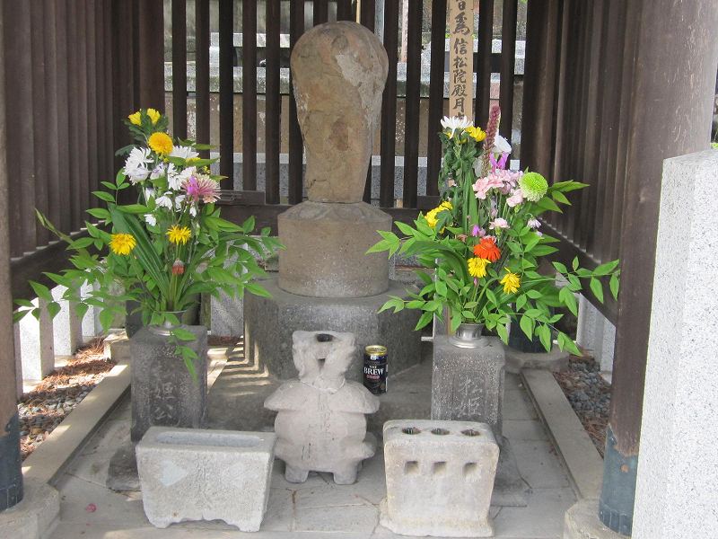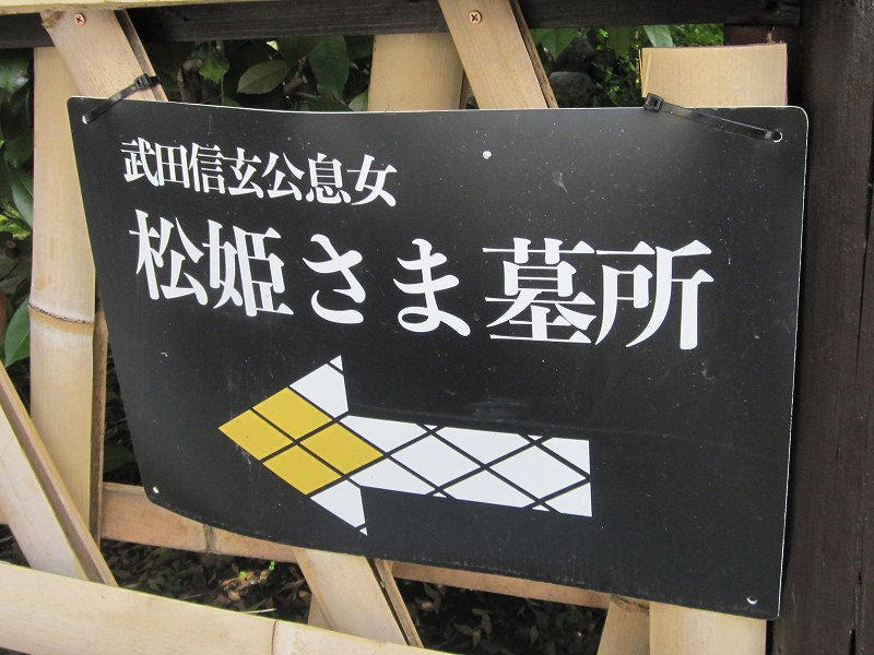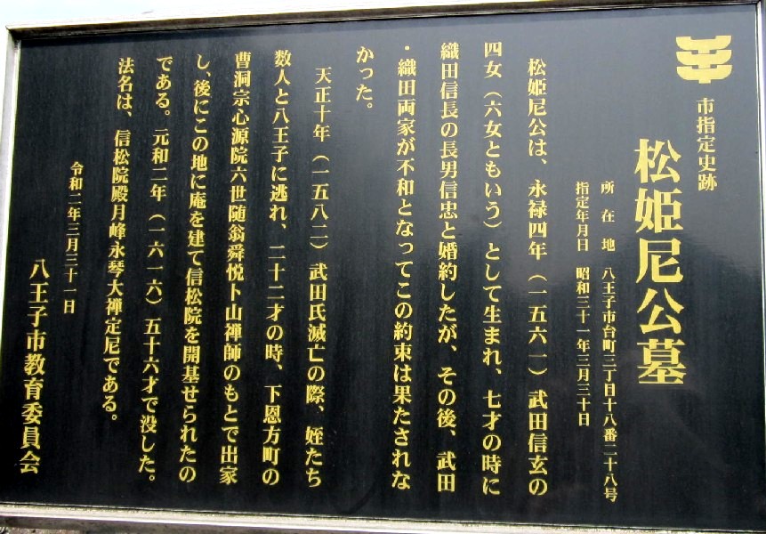 << 武田信玄公息女松姫君御手植ノ松−→市指定史跡「松姫尼公墓」 >> ● 武田信玄公息女松姫君御手植ノ松 ![]() ● 標識(←武田信玄公息女松姫さま墓所 観音堂右側) ![]() ● 標識(←松姫尼公墓所) ![]() ● 標識(松姫尼公墓所参道→) ![]() ● 市指定史跡「松姫尼公墓」 松姫尼公は、永禄四年(1561)武田信玄の四女(六女ともいう)として生まれ、七歳の時に織田信長の 長男信忠と婚約したが、その後、武田・織田両家が不和となってこの約束は果たされなかった。 天正十年(1582)武田氏滅亡の際、松姫は姪たち数人と八王子に逃れ、二十二歳の時、下恩方町の 曹洞宗心源院六世随翁舜悦ト山禅師のもとで出家し、後にこの地に庵を建て、信松院を開基した。 元和二年(1616)五十六歳で没。法名は「信松院殿月峰永琴大禅完尼」である。 令和2年3月31日 八王子市教育委員会 ![]() ![]() ![]() (画像をクリックすると大きくなります) ● (入口へ) ● |