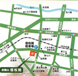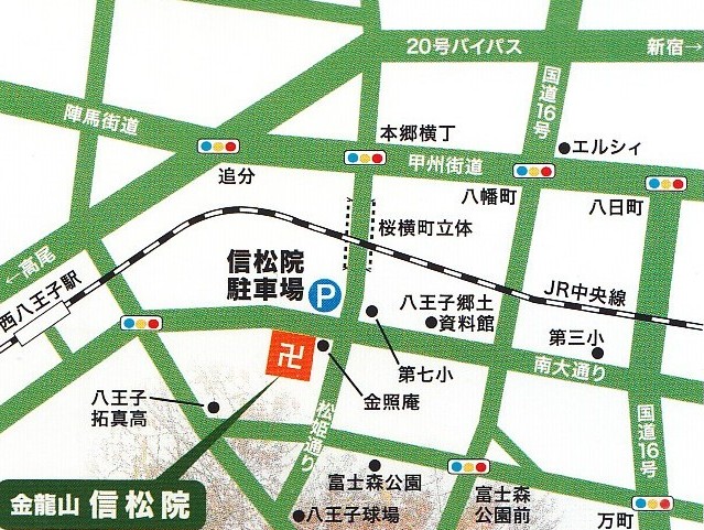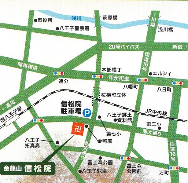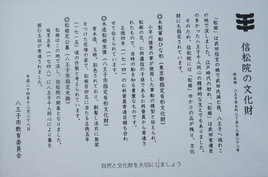 ● 信松院 信松院の文化財 所在地 八王子市台町3-18-28 「松姫」は武田信玄の娘で武田氏滅亡後、八王子へ逃れこの地で没しました。 江戸時代の初め、「松姫」は武田家遺臣の多かった八王子千人同心の精神的な支えもありました。 そのため、信松院には「松姫」ゆかりの品が残り、文化財にも指定されています。 ○ 木製軍ひな形(東京都指定有形文化財) 小早川隆景の軍が使用した軍船の模型と伝えられ、松姫の兄、仁科盛信の子孫である仁 科資真から寄進されたもので、当時の船を知る貴重なものです。 正徳4年(1714)の仁科資真寄進目録も合わせて伝えられています。 ○ 木造松姫坐像(八王子市指定有形文化財) 寄木造、玉眼。彩色されており、剃髪し法衣に袈娑をつけた尼僧の姿で、松姫百回忌に当 たる正徳5年(1715)頃の作製と考えられています。 ○ 松姫尼公墓(八王子市指定史跡) 松姫はこの地で没し、信松院の開基となりました。 延享5年(1748)に八王子千人同心により墓を囲む玉垣が寄進されました。 平成24年12月28日 八王子市教育委員会 仏教の五色旗 色の意味 ブッタの袈裟の色 あらゆる屈辱や迫害、誘惑などに耐え、怒らぬ「忍辱」を表します。 ブッタの歯の色 清らかな心で悪業や煩悩の苦しみを清める「清浄」を表します。 ブッタの血液の色 慈悲の心で人々の救済に満進する「精進」を表しております。 ブッタの身体の色 豊かな姿で揺るぎない性質を示す「金剛」を表します。 ブッタの頭髪の色 心乱れず穏やかな状態で力強く生き抜く「定根」を表します。 ![]() (左/山門)・・・(中/松姫様の東下之像)・・・(右/寺務所(総受付)) ![]() (左/茶筌塚)・・・(中/四諦(したい)・八正道(はっしょうどう)の手洗石)・・・(右/松姫出世地蔵) ![]() (左/佛殿)・・・(中/観音堂・舎利殿)・・・(右/布袋堂) ![]() (左/松姫尼公墓)・・・(中/穴守稲荷神社)・・・(右/カフェ「金照庵」・・ブティック「Belle Dame」) ![]() (1) 山門−→松姫様の東下之像−→禅語”本来無一文”→寺務所(総受付)−→ −→拝檀−→狗子有佛心−→茶筌塚−→四諦(したい)・八正道(はっしょうどう)の手洗石 (2) 佛殿−→観音堂・舎利殿−→布袋堂 (3) 武田信玄公息女松姫君御手植ノ松−→市指定史跡「松姫尼公墓」 (4) 松姫出世地蔵−→穴守稲荷神社−→カフェ「金照庵」−→ブティック「Belle Dame」 ● 山門 開閉時間 開門・・・午前八時 閉門・・・午後五時 参拝時間 堂内礼拝 開扉 午前八時四十五分 閉扉 午後三時四十五分 尚、墓所内に於かれましては閉門時間迄にお済ませください。 お寺の都合によっては多少前後する場合があります。 ● アクセス 電車の場合 JR西八王子駅より 徒歩約15分 バス 99系統 信松院下車 車の場合 中央道八王子IC(第2出口)より、市内方面へ15分 駐車場 山門の道を挟んで反対側 ![]() ![]() (信松院のHPを参考にしました) ● 松姫峠(山梨県大月市と小菅村の境にある標高1,250mの峠) 武田信玄の息女松姫が、八王子に逃げ延びる時に越えた峠という事で名付けられたそうです。 現在は峠下の松姫トンネル(国道139号バイパス)が開通して便利になりましたが、旧道は狭隘な 区間が多く、大月側は通行止めになっています。 小菅村側からはアクセス可能で、大菩薩峠や奈良倉山・鶴寝山への登山口にもなり、富士山や小 金沢連峰の眺望も楽しめます。 ![]() 近くの 八王子城跡・・滝山城跡・・片倉城跡・・武蔵陵墓地・・小宮公園 夕やけ小やけふれあいの里・・興慶寺・・永林寺・・高尾駒木野庭園・・宝生寺 高尾山・・小仏城山・・景信山・・陣馬山・・今熊山・・多摩森林科学園 を載せてあります。 (画像をクリックすると大きくなります) ● (ホームへ) ● |