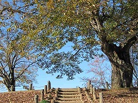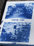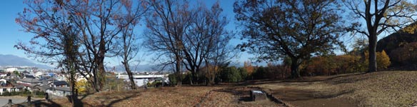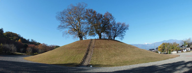頂上は、広いです。 竪穴式石室(丸山塚古墳) この石室は、埋葬された豪族の遺体を納めた部屋で、木製の棺の周囲に、板状、柱状の 石を積み上げて造られていると思われる。 明治40年、開墾によって蓋石が開かれ、鏡1、鉄斧2、鎌1、石釧1などが発見されたが、棺 と遺体は残っていない。 石室は、長さ5.5メートル、幅は平均0.95メートル、高さ0.85メートルの規模で、床には赤色 顔料が塗られている。 昭和59年の調査で石室両側中央に3〜4センチの赤色円文が約30ほど発見された。 出土品は東京大学所蔵。